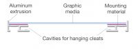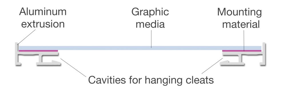 The thin perimeter frame consists of aluminum extrusions with a flat surface for graphic, a 3/16” high lip and a french cleat receptor built in for easy mounting to a wall.   Easily mount them on walls, built-ins, countertops, hotel doors, elevator walls, and more.