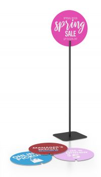 Lollipop Stands come in a standard black color with a round base and 13” or 15” in diameter. Our speciality is custom so if you need a custom base, custom color, or custom shape, we can help! We can provide custom powder coating colors using RAL or PMS color matching.