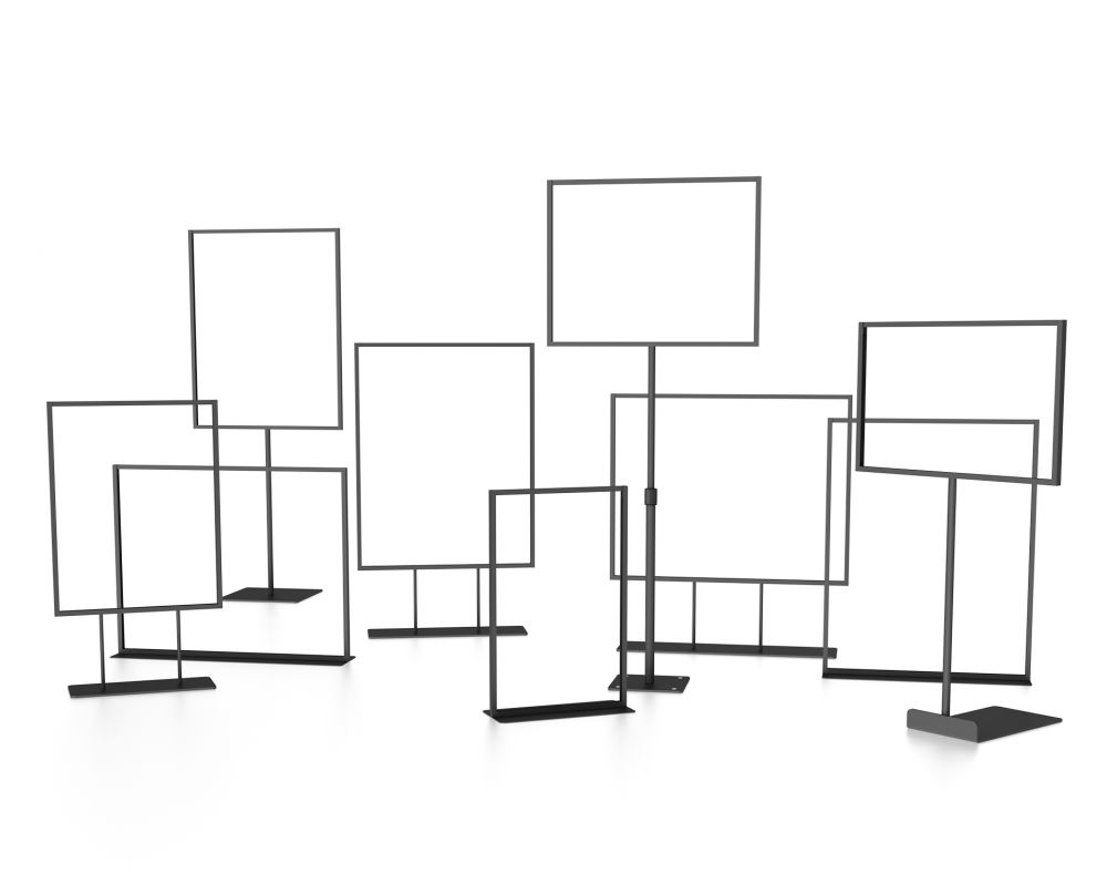 Frame sizes, Bases, Swivels, Stand-offs, Clamps, Mounts, Brackets, Colors We manufacture a wide range of custom Framette steel sign holders. With a 1/2" Profile, the Framette is a thin and light steel frame. Available in custom sizes and in a variety of form factors, from magnetic mount to countertop, slatwall framette graphic frames, framette graphic frames with custom clamps. Bring us your graphic design / visual retail challenges and we're happy to let you know what we can do. Minimum quantities do apply for custom Framette frames.