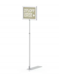 If you are looking for pallet signholder with frame instead of hooks to display graphics and media, the PLT-PX1 is a great option. This is a drop in graphic pallet stand, ideal for 8-½” x 11” paper graphics. This is a height adjustable sign holder and adjusts to up to 50” high and works with horizontal or vertical applications. It has a matching silver 4” x 14” shovel base to keep it in place. Instead of hooks, this unit has an 8 ½ x 11” matching drop in frame in satin silver that attaches to the upright. The top loading drop in frame style makes it easy to install and swap out graphics on this pallet stand. This drop in frame works with graphics and media up to 3/16” thick.