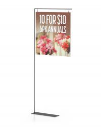 These units make great pallet sign holder combo kits because they are designed to easily integrate with rigid, styrene or paper graphics. The PLT-1 adjustable pallet sign holder is a heavy duty shovel base pallet stand made with telescopic aluminum tubing that adjusts to up to 72” high and comes in a standard satin silver finish. It has a 24” cross bar with hooks fixed at 18” on center to easily hang graphics. Instead of hanging graphics from the hooks, this height adjustable sign holder also works as a pole pocket sign holder. Easily slide pole pocket graphics over the top crossbar.