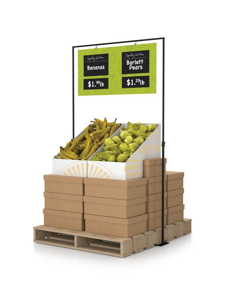 Do you use pallets to display product in your supermarket or retail store? Do high ceilings make it tricky to use hanging graphics and hardware?  Do you want to maximize their retail sales floor space and draw attention to products without bulky hardware displays?  Check out our Stellar Pallet stands.