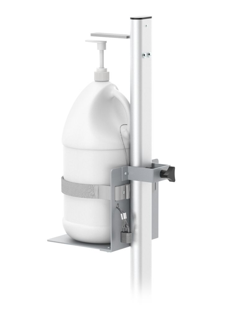 • Can hold a wide variety of pump action bottles up to and including 1 gallon sanitizer jugs with center mounted pumps