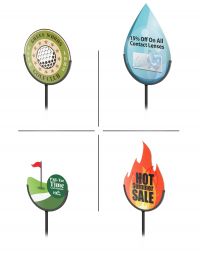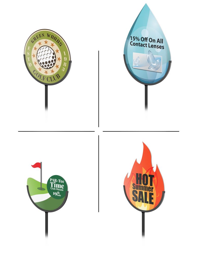 Lollipop Stands, custom graphics, U-shaped graphics, and circular graphics are available. Custom shape and size graphics can be quoted quickly.