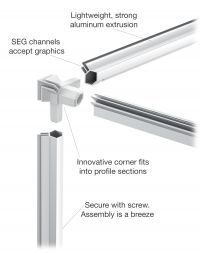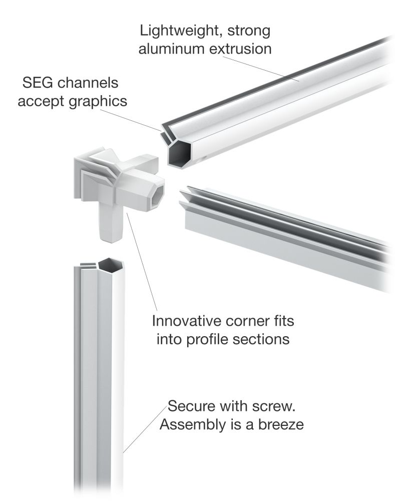 On site, the Charisma 3D offers ultra quick setup and assembly with just a philips head screwdriver making it easy for associates to install the hardware on site.   And this 3D Design provides for quick SEG graphic changeouts which makes it easy to swap out graphics for a new season, sale or message.