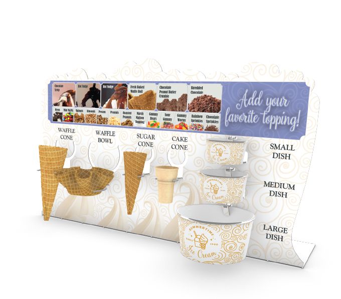Origami™ Ship Flat display, this unit includes components that fold out of a single sheet of steel to hold cones, cups, and the latest topings menu. Easily updatable and re-brandable, this display offers the durability of steel, the flexibility of drop in holders, and a clear place to start for every customer visit.