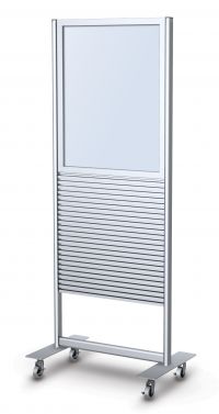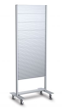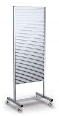 These portable slat wall solutions are available as a single sided portable slat wall or double-sided portable slat wall stand. They are available in etched and clear satin silver aluminum. Standard these units are 25” wide at the bases and 70” high without headers or 79” high with headers. They are designed with 1” on center aluminum slatwall that work with all compatible accessories.